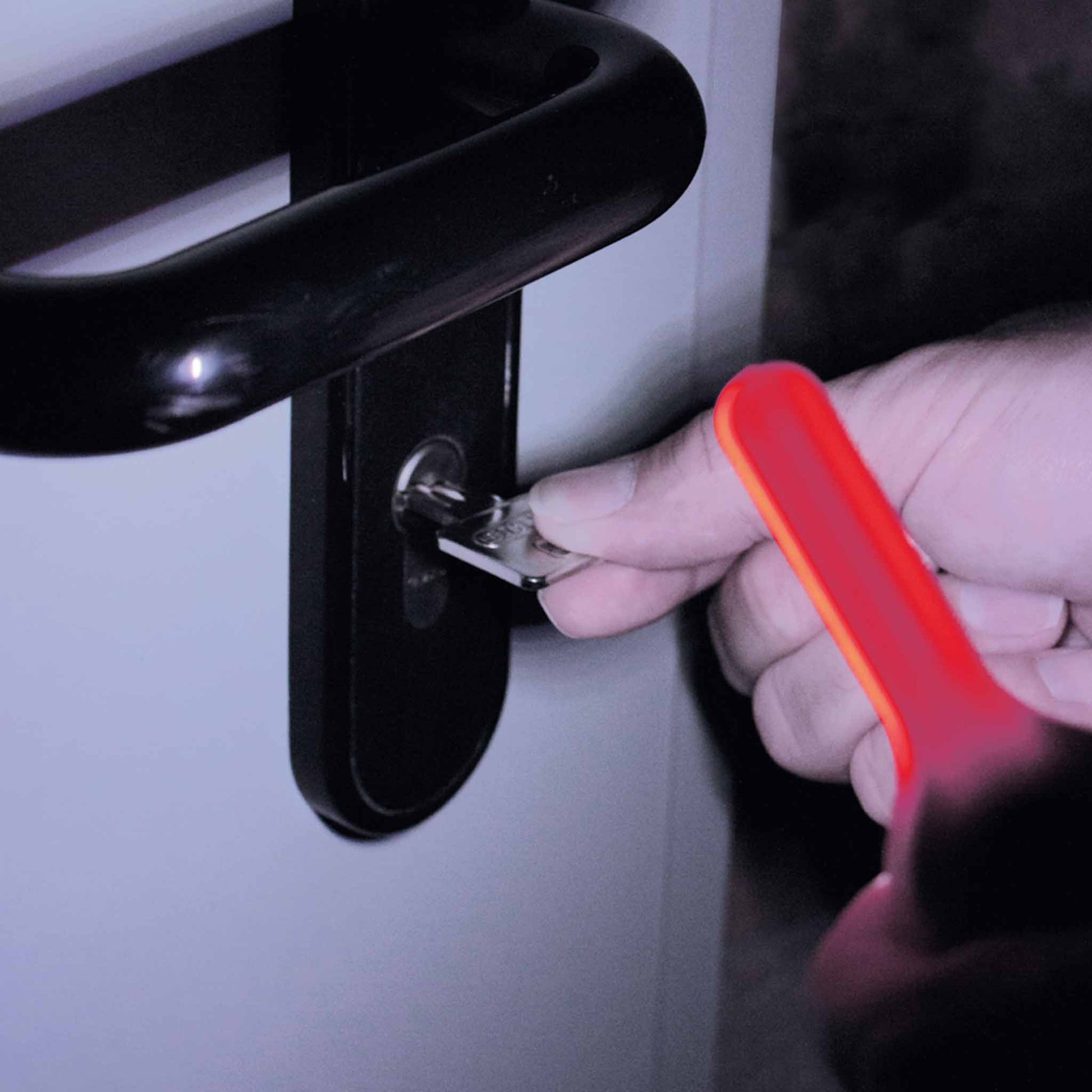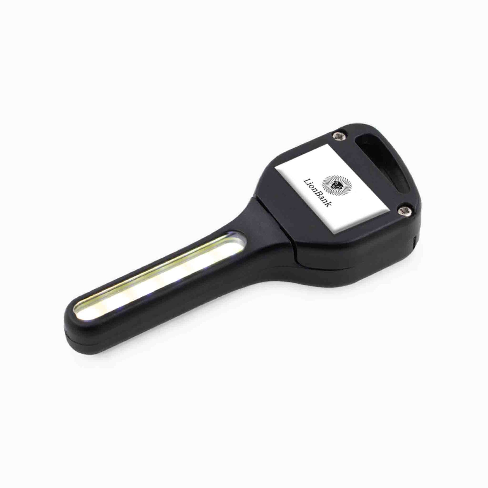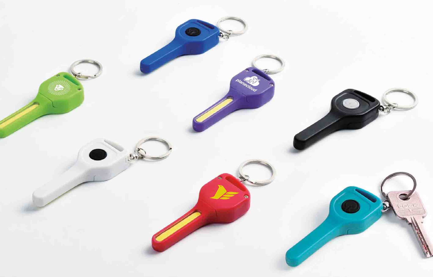 Schlüsselanhänger mit integrierter COB Lampe mit 3 unterschiedlichen Lichteinstellungen in Schlüsselform. Die Veredelung erfolgt durch ein 4-farbiges Doming. Standardfarbe: schwarz und weiß; weitere Farben auf Anfrage (ab 3.000 Stück).