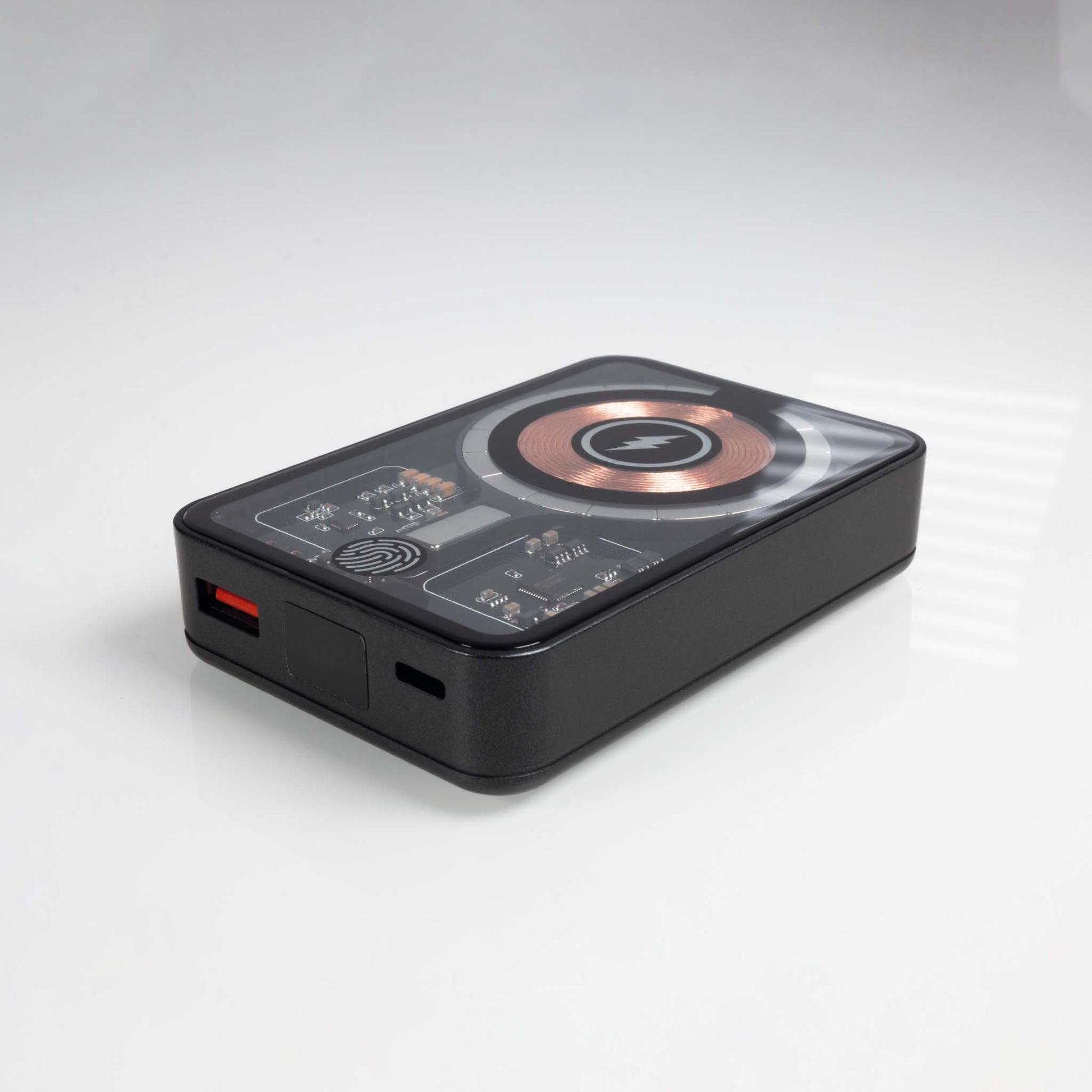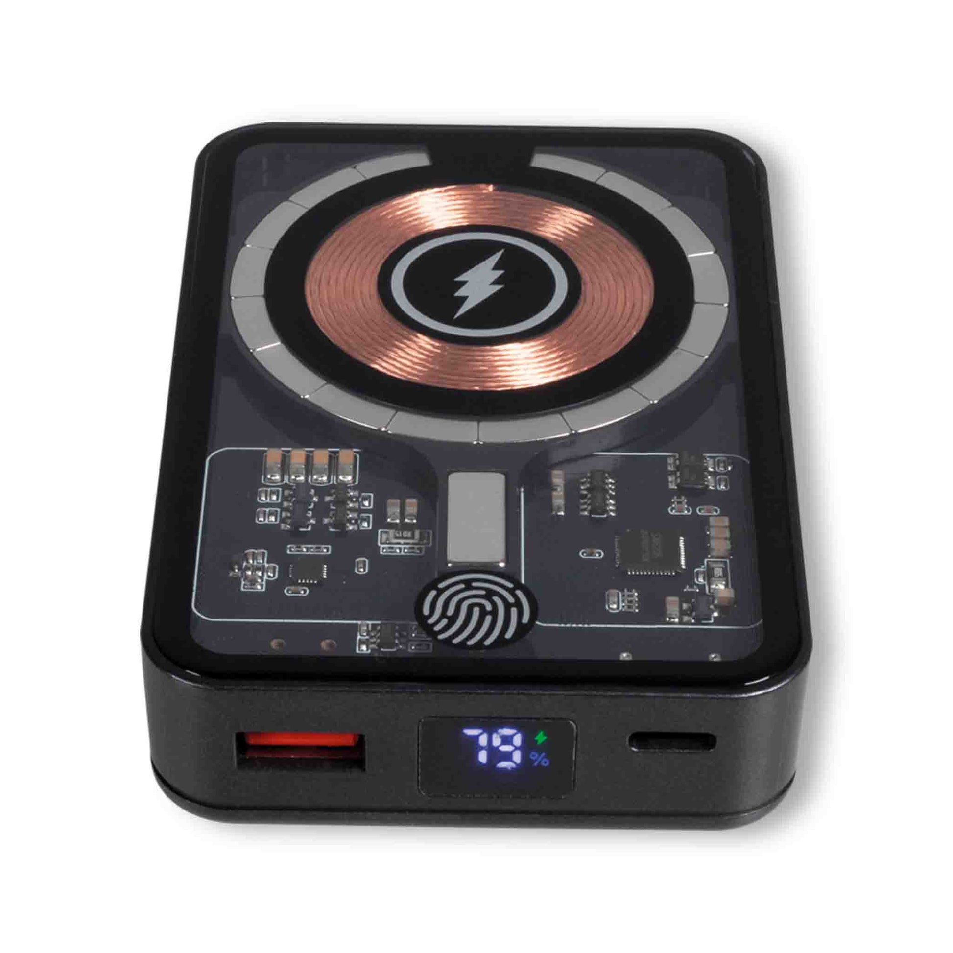 PowerBank in an elegant, transparent design, with charge level indicator, wireless charger and magnetic MagSafe function.